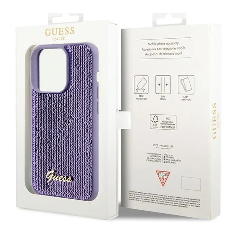 Ovitek Guess Sequin Script Metal za Apple iPhone 15 Pro Max – vijolična