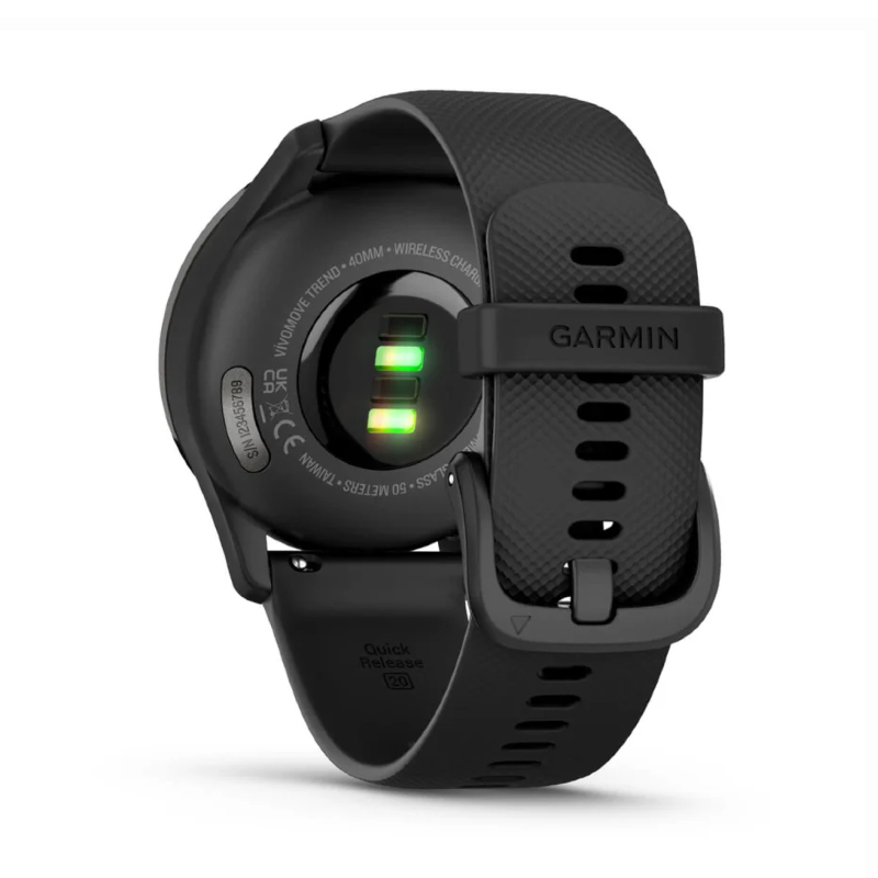 VívoMove® Trend je elegantna hibridna pametna ura, ki združuje klasični analogni videz s skritim zaslonom na dotik. Nudi do 5 dni avtonomije baterije, pametna obvestila, brezstično plačevanje Garmin Pay™ ter napredne funkcije za spremljanje zdravja (srčni utrip, spanje, stres, Body Battery™). Vodoodporna je in primerna za plavanje, omogoča brezžično polnjenje in je združljiva z 20 mm paščki. Popolna izbira za tiste, ki želijo pametno tehnologijo v elegantni obliki.